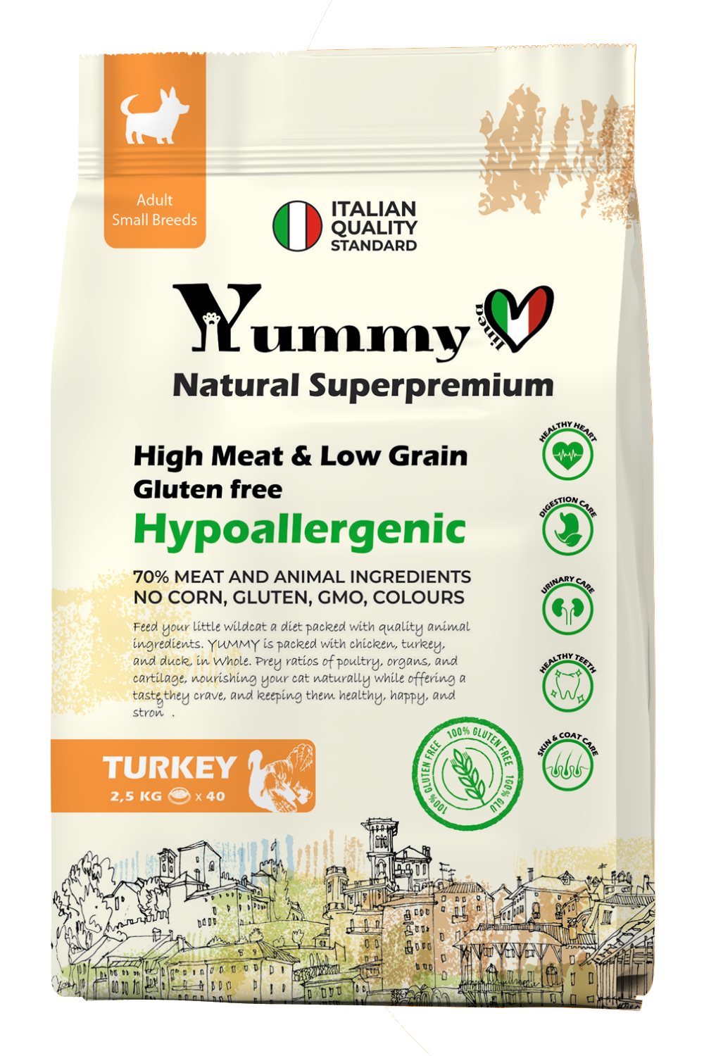 Yummy Linea представляет превосходный сухой корм для взрослых собак мелких пород с индейкой — идеальное решение для заботливых владельцев маленьких питомцев. Этот супер-премиум корм разработан специально для удовлетворения всех потребностей миниатюрных четвероногих друзей, обеспечивая их сбалансированным и полноценным питанием.