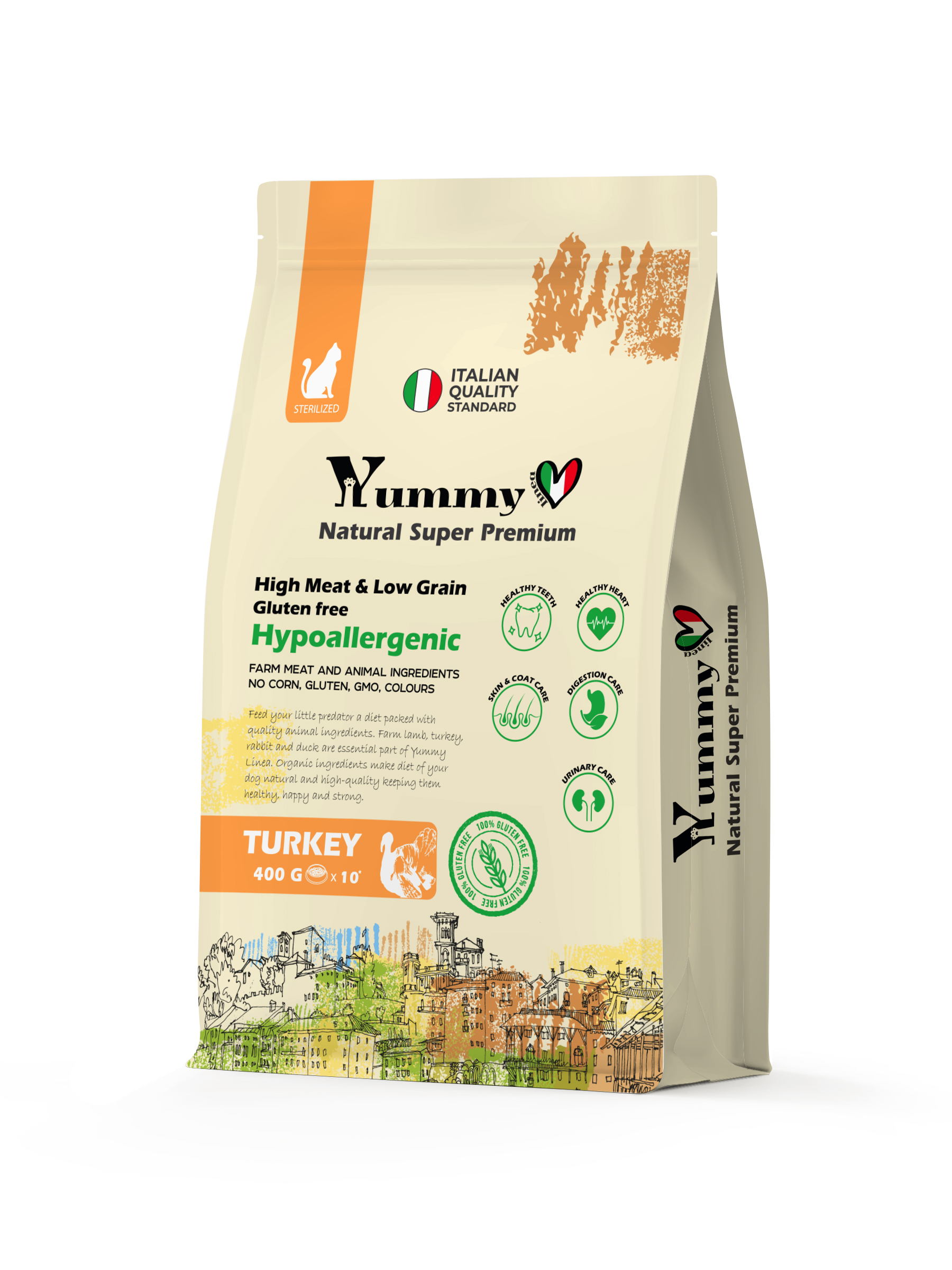 Yummy Linea представляет превосходный сухой корм для взрослых стерилизованных кошек с индейкой, который станет идеальным выбором для вашего питомца. Этот продукт супер премиум класса разработан специально для удовлетворения особых потребностей кастрированных котов и кошек, а также подходит для пожилых животных. Что делает этот корм таким особенным? Прежде всего, его уникальный состав. В основе лежит дегидрированное мясо индейки, которое составляет не менее 42% от общего состава. Это обеспечивает высокое содержание белка — 27%, что крайне важно для поддержания мышечной массы у стерилизованных животных. Кроме того, в состав входят натуральные ингредиенты, такие как рис, картофель, горох и жир индейки, которые обеспечивают сбалансированное питание. Вы заботитесь о здоровье своего питомца? Тогда вам будет интересно узнать, что этот корм содержит специальный комплекс добавок для поддержания здоровья мочеполовой системы. Клюква и шиповник, входящие в состав, обладают антибактериальным действием и помогают предотвратить развитие мочекаменной болезни. А L-карнитин способствует контролю веса, что особенно важно для стерилизованных кошек. Но это еще не все! Корм Yummy Linea также заботится о красоте вашего питомца. Оптимальное соотношение омега-3 и омега-6 жирных кислот способствует поддержанию здоровой кожи и блестящей шерсти. А экстракт юкки Шидигера помогает уменьшить неприятный запах от лотка. Задумывались ли вы когда-нибудь о том, насколько важно качество корма для здоровья кишечника вашей кошки? Yummy Linea позаботился и об этом. В состав входят пребиотики MOS и FOS, которые способствуют восстановлению и поддержанию здоровой микрофлоры кишечника. Это особенно важно для кошек с чувствительным пищеварением. Корм не содержит ГМО, искусственных добавок и является гипоаллергенным продуктом. Это делает его идеальным выбором для кошек с пищевой чувствительностью. Кроме того, отсутствие кукурузы и пшеницы в составе снижает риск аллергических реакций. Удобная упаковка весом 400 гр с zip-застежкой и вакуумной упаковкой обеспечивает длительное хранение корма без потери его полезных свойств. Хранить корм рекомендуется в защищенном от солнца месте. Этот сухой корм для кошек подходит для животных любого размера и породы. Будь у вас маленькая изящная кошечка или крупный мейн-кун, Yummy Linea обеспечит их всем необходимым для здоровой и активной жизни. Интересно, что в состав корма входит экстракт корня женьшеня, известный своими тонизирующими свойствами. Это может быть особенно полезно для пожилых кошек, помогая им сохранять бодрость и энергию. Yummy Linea — это не просто корм, это комплексная забота о здоровье вашего питомца. Он обеспечивает профилактику мочекаменной болезни, способствует контролю веса и восстановлению микрофлоры кишечника. Все это делает его отличным выбором для ежедневного кормления вашей любимой кошки. Производится этот замечательный корм в России, что гарантирует его доступность и свежесть. Выбирая Yummy Linea, вы выбираете качество, заботу и любовь к вашему питомцу. Дайте вашей кошке лучшее — подарите ей здоровье и долголетие с кормом Yummy Linea!